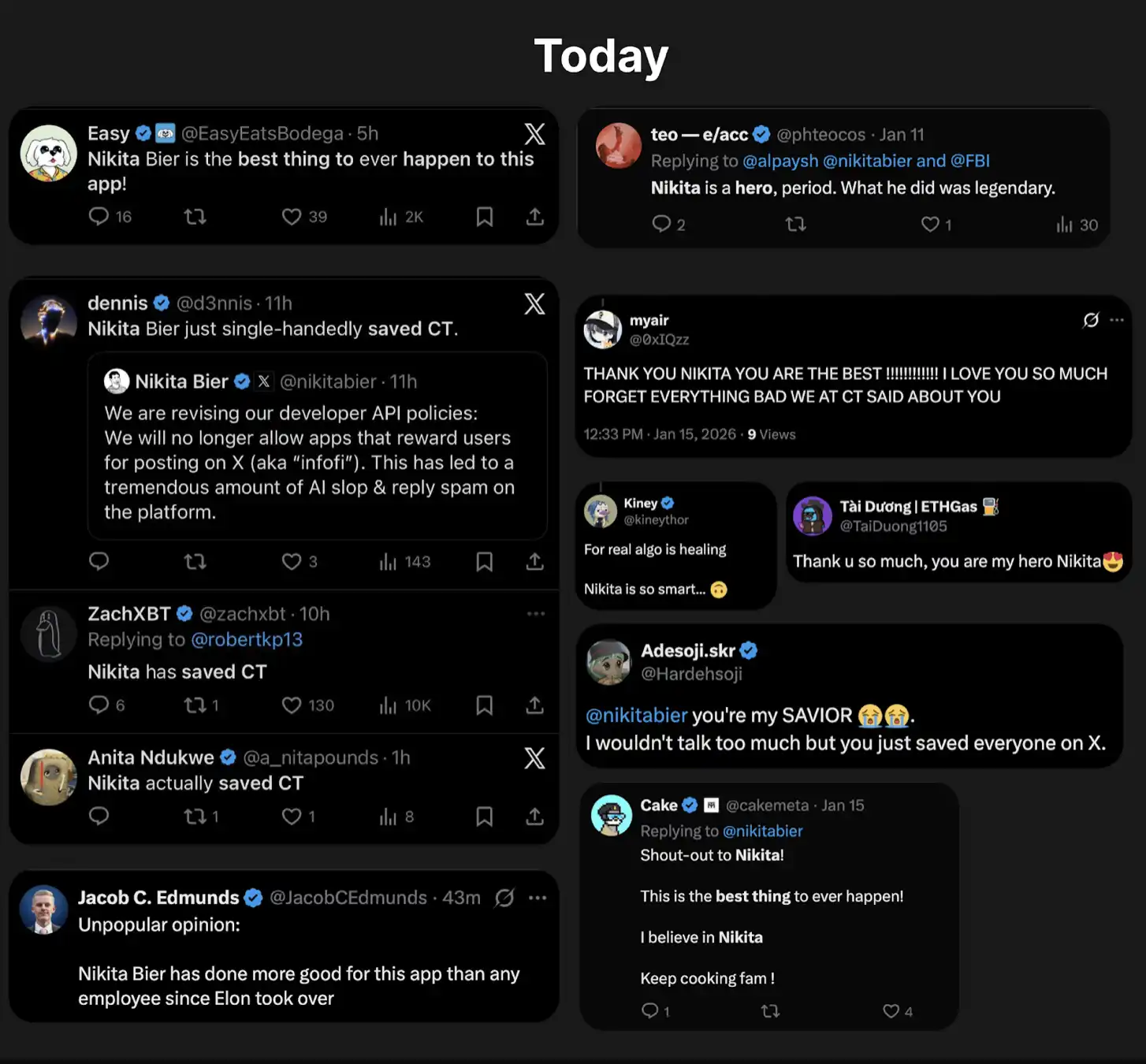 1 月 15 日:Nikita Bier 的公开发帖发布。Kaito 与所有人一样,几乎同时得知最终决定。