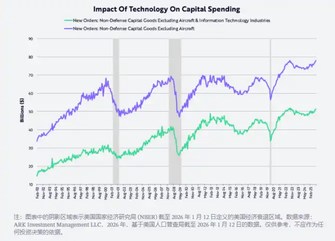 如下所示,人工智能的蓬勃发展正推动资本支出达到自上世纪九十年代末以来的最高水平。2025 年,数据中心系统(包括计算、网络和存储设备)的投资增长了 47%,达到近 5000 亿美元,预计 2026 年还将增长 20%,达到约 6000 亿美元,远高于 ChatGPT 推出前十年每年 1500 亿至 2000 亿美元的长期趋势。如此巨大的投资规模不禁让人发问:「这项投资的回报是什么?又将在哪里体现?」
