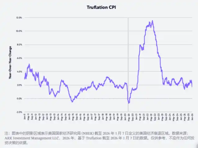 在宏观层面,Wood 预测在生产力繁荣的推动下,通胀将进一步受控,甚至可能转负。她预计,未来几年美国名义 GDP 增长率将维持在 6% 至 8% 的区间,主要由生产力提升驱动,而非通胀。