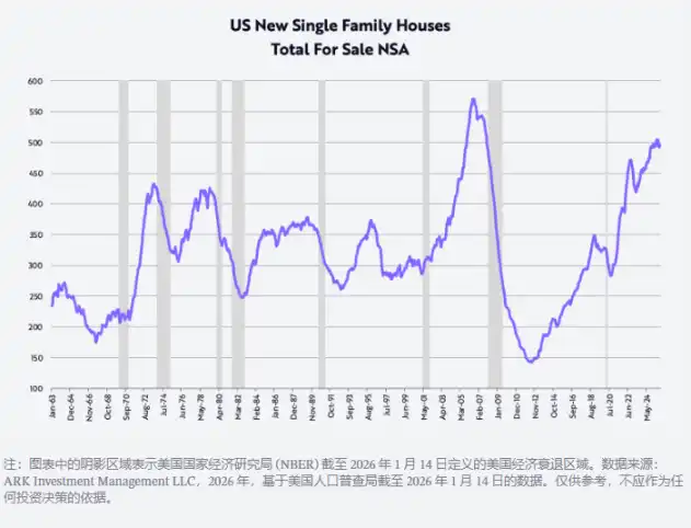 第四季度,为了消化接近 50 万套的新建独栋住宅库存(如下图所示,这是自 2007 年 10 月全球金融危机爆发前夕以来的最高水平),三大住宅建筑商大幅下调了房价,同比降幅分别为:莱纳(Lennar)-10%,KBHomes-7%,以及 DRHorton-3%。这些价格下跌的影响将在未来几年内滞后反映在消费者物价指数(CPI)中。