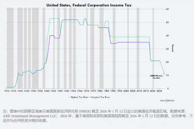 放松监管正在各个领域释放创新活力,其中在人工智能和数字资产领域,由首位「人工智能和加密货币沙皇」大卫·萨克斯(David Sacks)领衔。与此同时,小费、加班费和社会保障税的降低,将在本季度为美国消费者带来可观的退税,这可能会推动实际可支配收入的年化增速从 2025 年下半年的约 2%,跃升至本季度的约 8.3%。此外,随着制造设施、设备、软件以及国内研发支出享受加速折旧,企业的有效税率将被压低至接近 10%(如下图所示),企业退税规模预计将大幅上升,而 10% 是全球最低的税率之一。