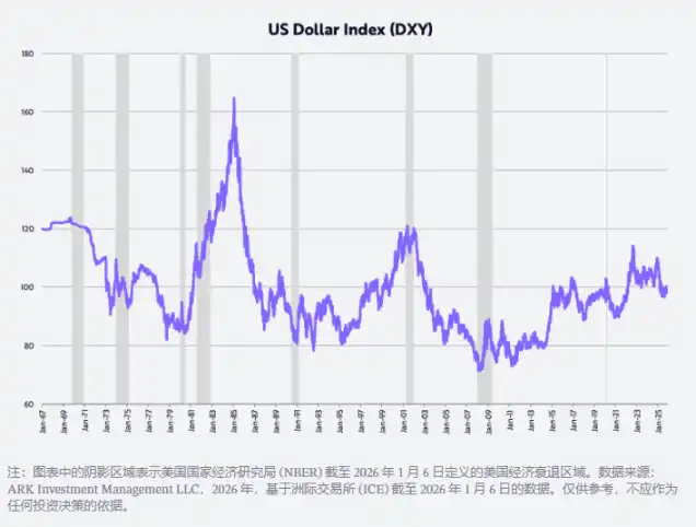 在市场影响方面,Wood 预测美国投资回报率的相对优势将推动美元汇率大幅走高,重演 1980 年代美元几乎翻倍的行情。她警告称,尽管金价在过去几年大幅上涨,但美元的走强将压制金价,而比特币因其供应机制和低资产相关性,将展现出与黄金不同的走势。