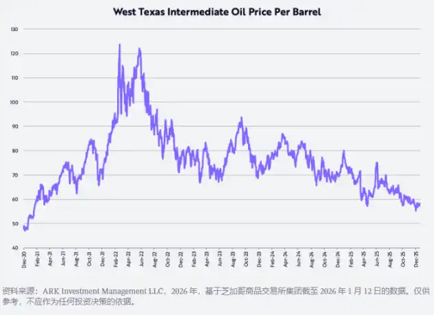 在过去几年里,以消费者价格指数(CPI)衡量的通胀一直顽固地徘徊在 2% 至 3% 的区间内,但在未来几年,出于下图所示的若干原因,通胀率很可能会下降到一个出人意料的低水平——甚至可能为负。首先,西德克萨斯中质原油(WTI)价格自 2022 年 3 月 8 日新冠疫情后的高点约 124 美元 / 桶以来,已下跌约 53%,目前同比下降约 22%。