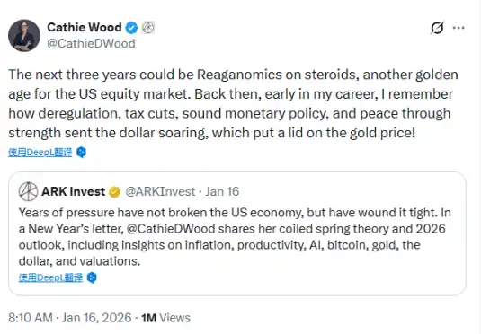 ARK Invest 创始人 Cathie Wood(「木头姐」)在最新的 2026 年新年致投资者信中发布宏观展望,将未来三年比作「加强版里根经济学」(Reaganomics on steroids)。她指出,随着放松管制、减税、稳健的货币政策以及创新技术的融合,美国股市将迎来另一个「黄金时代」,而即将到来的美元飙升可能会为金价的上涨势头画上句号。