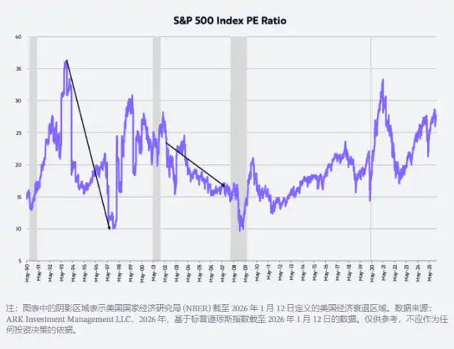 对于投资者关注的市场估值问题,Wood 并不认为 AI 泡沫已经形成。她指出,虽然目前市盈率处于历史高位,但随着 AI、机器人等技术推动生产力爆发,企业盈利增长将消化高估值,市场可能会在市盈率压缩的同时实现正回报,类似于 1990 年代中后期的牛市路径。