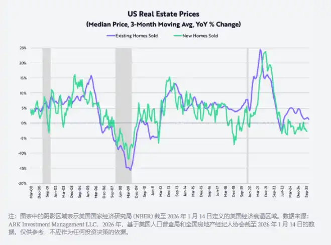 自 2022 年 10 月达到峰值以来,新建独栋住宅的销售价格已下降约 15%;与此同时,现有独栋住宅的价格通胀率——基于三个月移动平均——已从 2021 年 6 月新冠疫情后峰值时同比约 24%,下降至约 1.3%,如下图所示。