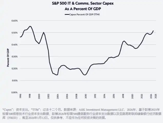 与此同时,以非国防资本品(不包括飞机)衡量的资本支出在 2022 年中期达到峰值,此后无论是否受到技术影响,该支出水平都已回升至该水平。事实上,自科技和电信泡沫破裂以来,这一资本支出指标已挣扎了 20 多年才得以突破,直到 2021 年,新冠疫情相关的供应冲击迫使数字和实体投资双双加速增长。曾经的支出上限似乎已转变为支出下限,因为人工智能、机器人、储能、区块链技术和多组学测序平台已准备就绪,即将迎来黄金时代。继上世纪 90 年代的科技和电信泡沫之后,约 700 亿美元的支出峰值持续了 20 年,如今,正如以下图示所示,这可能是历史上最强劲的资本支出周期。我们认为,人工智能泡沫的出现还遥遥无期!