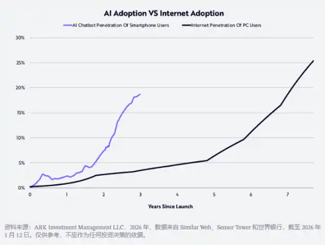 除了半导体和上市的大型云公司之外,尚未上市的 AI 原生企业也受益于增长和投资回报。AI 公司是历史上增长最快的企业之一。我们的研究表明,消费者接受 AI 的速度是上世纪 90 年代接受互联网速度的两倍,如下所示。