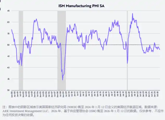 以美国采购经理人指数(PMI)衡量,制造业已连续约三年处于收缩状态。根据这一扩散指数,50 是扩张与收缩的分界点,如下图所示。