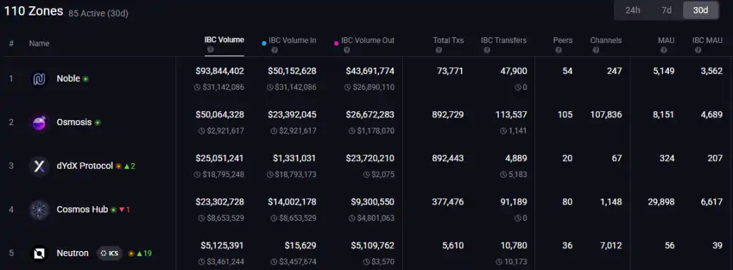 Noble 是 Cosmos 唯一的「超巨」。Noble 的 30 天 IBC 交易量高达 9,384 万美元,这一数字是排名第二的 Osmosis(5,006 万美元)的 1.8 倍。在 Cosmos IBC 链接的 110 个 Zones 中,Noble 贡献了断层级别的流动性。
