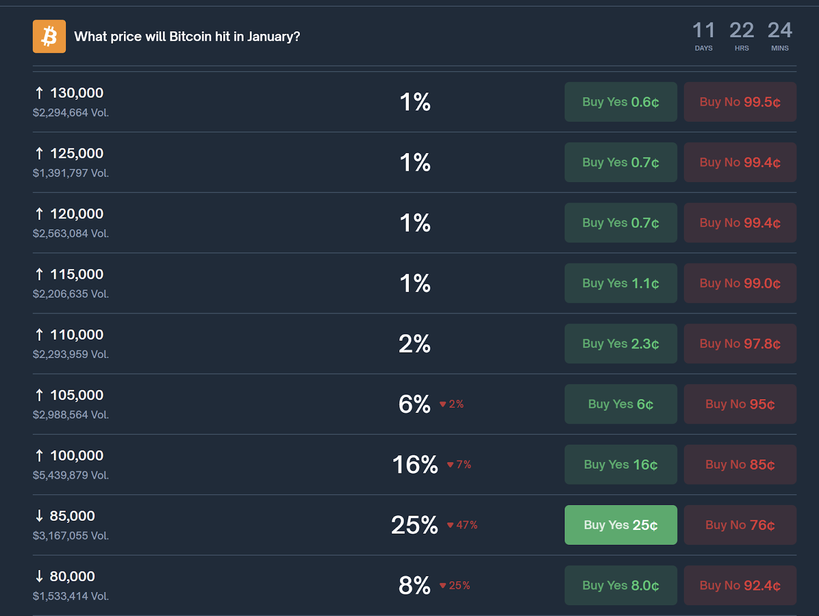 这些宏观动态正日益反映在预测市场中。在 Polymarket 平台上,受近期波动性飙升的影响,1 月份比特币价格合约的价格出现了大幅调整。1 月份比特币触及 10 万美元的概率已降至 15%左右,而 10.5 万美元或 11 万美元等更高目标的概率则仅为个位数。
