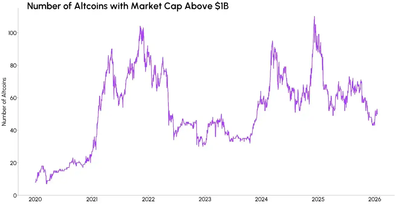 我们也可以通过突破特定市值门槛的代币数量,来观察这一集中化趋势。尽管加密市场总市值屡创历史新高,但市值超 10 亿美元的山寨币数量,已从 2021 年峰值时的约 105 种缩减至目前的约 58 种。这意味着,即便市场中的资产总量在增加,真正具备「可投资性」的山寨币却在不断减少。尽管这并不代表山寨币板块将走向衰落,但市场资金的关注焦点,或将进一步向具备坚实基本面、抗风险能力更强的标的集聚。