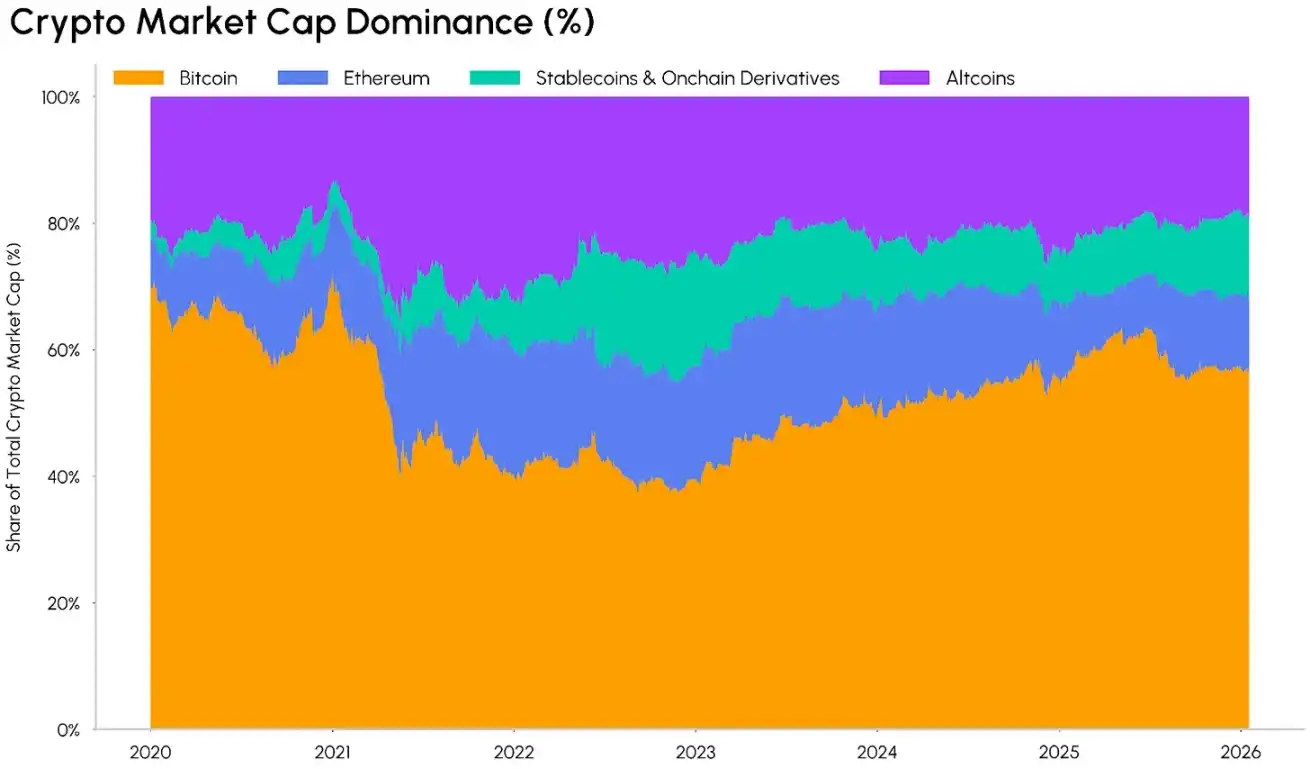 加密市场中其他资产的结构也在发生转变。目前市值超 3000 亿美元的稳定币,以及链上衍生品在市场总市值中的占比正不断提升。这类代币在加密生态中承担着不同的功能:稳定币是市场中最主要的交易媒介,而链上衍生品则为投资者提供了对底层资产的收益索取权,或是创造生息收益的渠道。