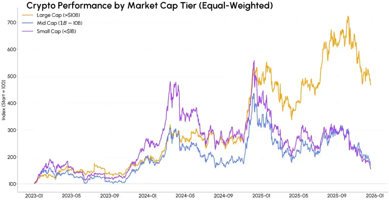 这一资本集中化趋势也体现在资产收益表现上。2023 年以来,中盘币(市值 10 亿 - 100 亿美元)、尤其是小盘币(市值不足 10 亿美元)曾在 2024 年的早、晚两个阶段跑赢大盘币(市值超 100 亿美元),但这一走势在 2025 年发生了剧烈反转,背后原因是市场对 Meme 币及其他短期叙事轮动的情绪快速消退。