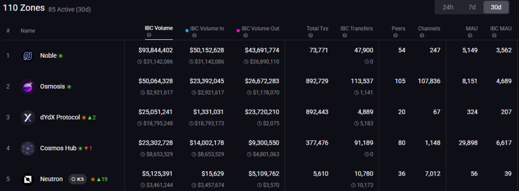Noble 是 Cosmos 唯一的「超巨」 。Noble 的 30 天 IBC 交易量高达 9,384 万美元,这一数字是排名第二的 Osmosis(5,006 万美元)的 1.8 倍。在 Cosmos IBC 链接的 110 个 Zones 中,Noble 贡献了断层级别的流动性。