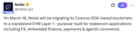 1 月 20 日,专注于稳定币的 Cosmos 应用链 Noble 宣布将从 Cosmos 生态迁移至独立的 EVM L1 网络。Noble EVM 计划于 3 月 18 日启动,团队将在短期内继续支持基于 Cosmos 的区块链。迁移后,Noble 自己的 USDN 稳定币将成为 EVM L1 的核心功能,NOBLE 代币将作为治理资产,将协议决策和价值与整个网络中的稳定币使用情况紧密挂钩。