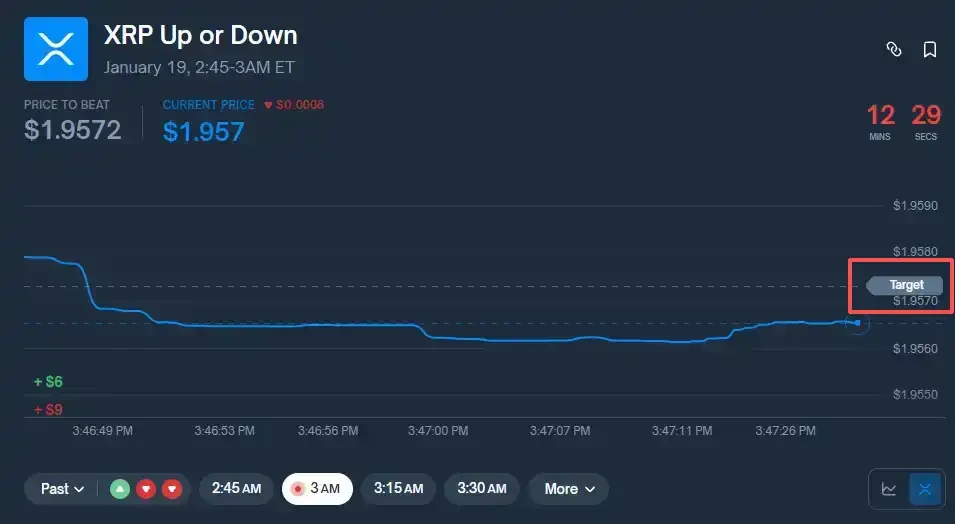 如图,Price To Beat 对应起始价,Current Price 对应实时价格。右上角红色「12:29」对应距离结算剩余时间。若价格线在结算时处于图中「target」上方,则押注「上涨」获利,反之则押注「下跌」获利。