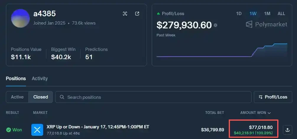 2026 年 1 月 17 日下午,a4385 在「XRP 15 分钟后上涨或下跌」中押注「上涨」。