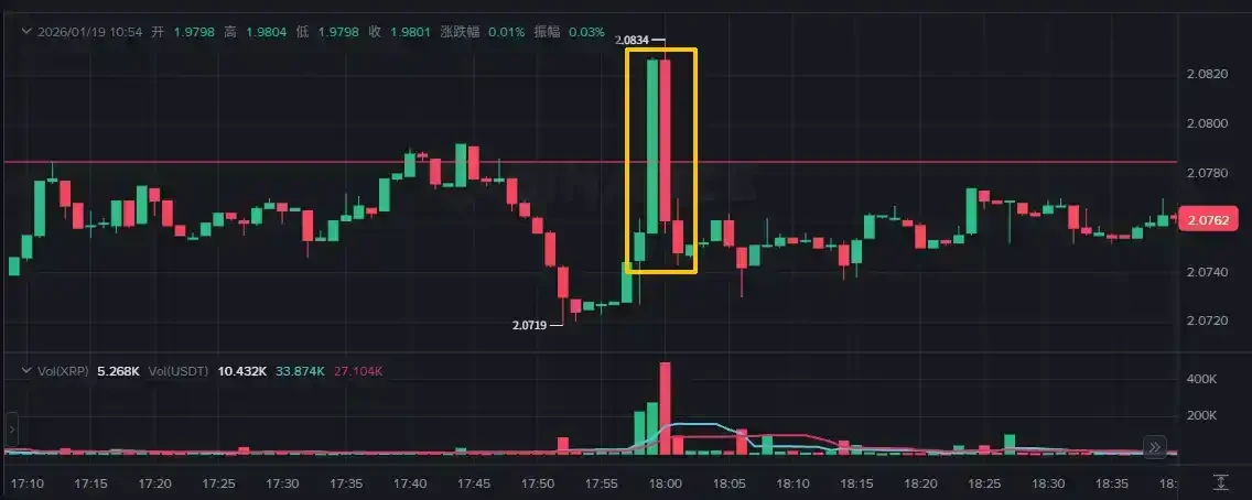 在对应的 XRP 价格图表上,一直到 17:59 前,其价格均徘徊在 2.074 左右。而最后一分钟内,多笔异常的大额交易量涌入,导致价格瞬间突破起始价(红色水平线)。