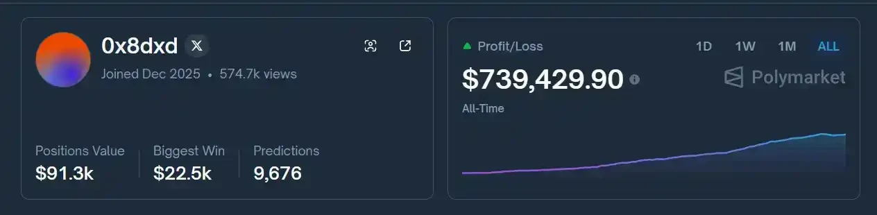 0x8dxd 就是众多量化机器人中的一个完美例子:自 2025 年 12 月 5 日上线以来,在过去的 44 天内累计收益 74 万美元,平均每天参与 219 个不同市场,其收益曲线非常平滑。