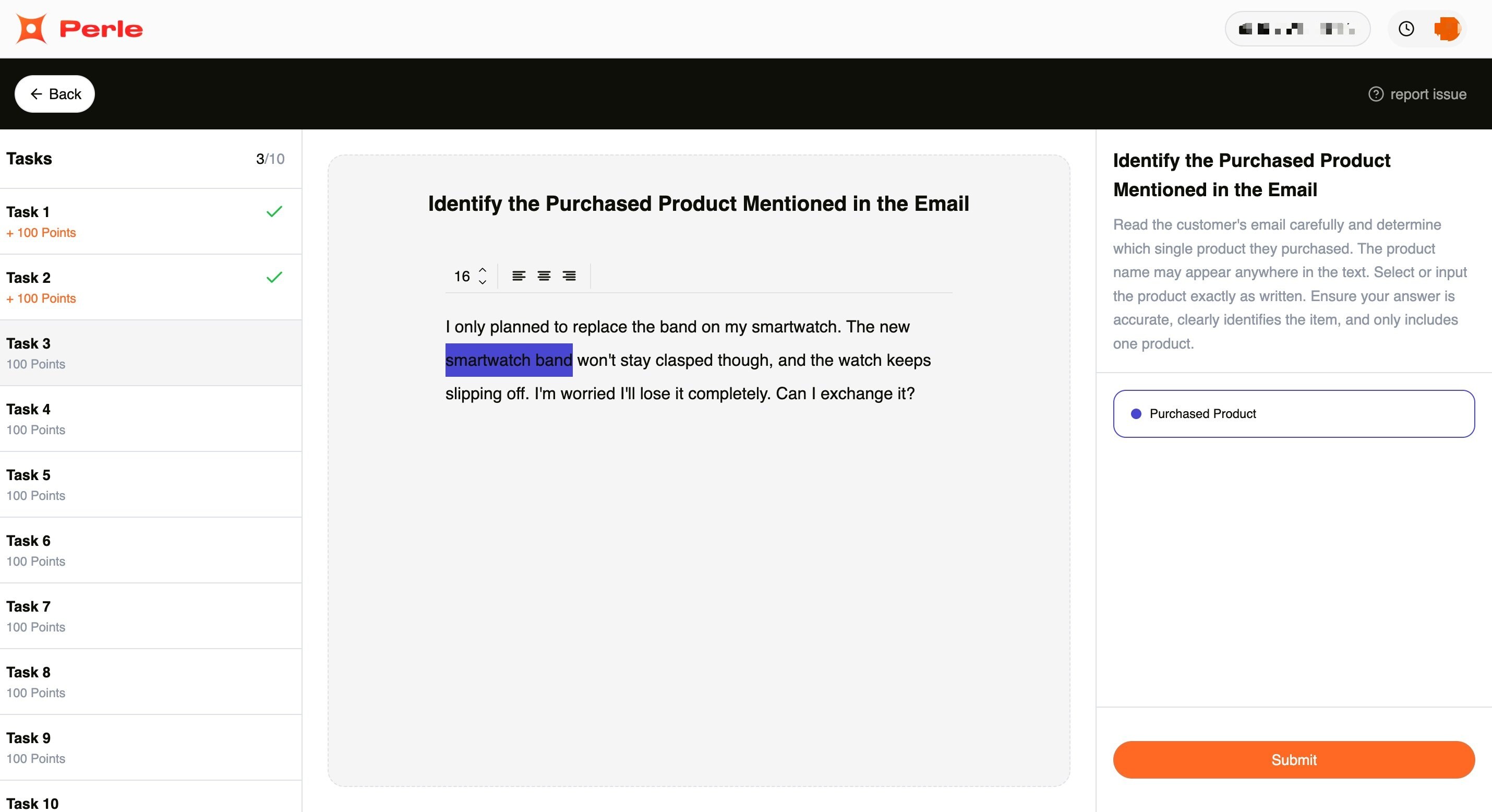 任务 3. Join The Perle Labs Product Tagging Quest,在投诉邮件信息中找到提及的产品,共 10 题,每题 100 积分,共 1000 积分。