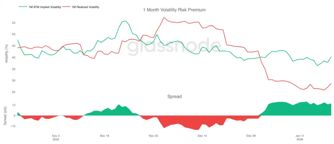 这种动态会自我强化,抑制波动率上升。只要卖出波动率有利可图,就会有更多参与者加入,从而将隐含波动率压制在较低水平。截至 1 月 20 日,一个月期波动率利差约为 11.5 个波动率点,有利于卖方,这充分说明了当前环境对卖出波动率行为依然友好。