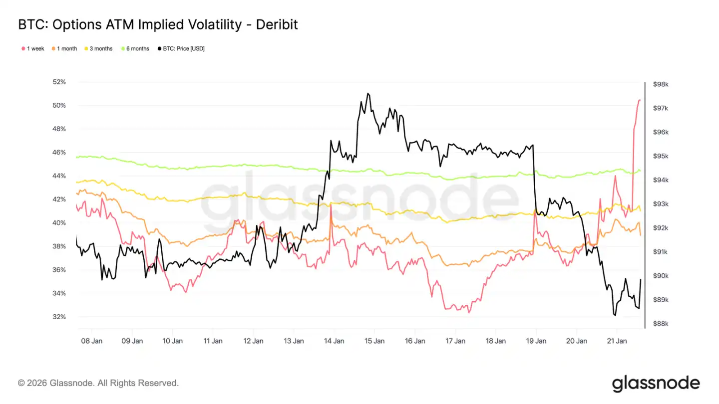 波动率曲线最前端的这种急剧陡峭化表明,交易者正在进行战术性操作,而非重新评估中期风险结构。只有短期波动率调整,反映的是事件驱动的不确定性,而非整个波动率体系的转变。
