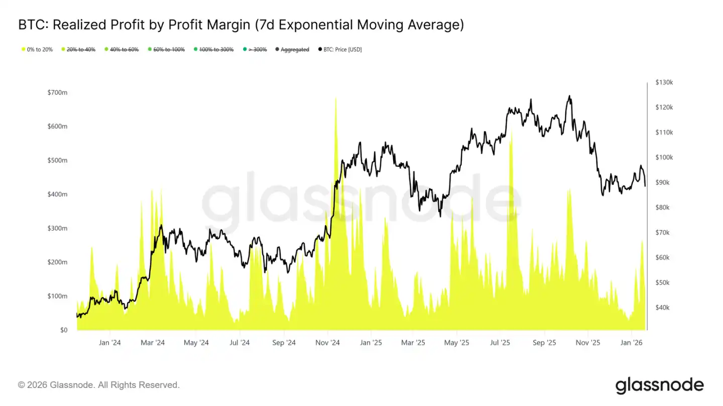 与此同时,按利润率划分的实现利润数据表明,利润率在 0% 至 20% 区间的获利了结占比显著上升。这凸显了「盈亏平衡卖家」和短期波段交易者的影响,他们倾向于小幅盈利即离场,而非等待趋势延续。