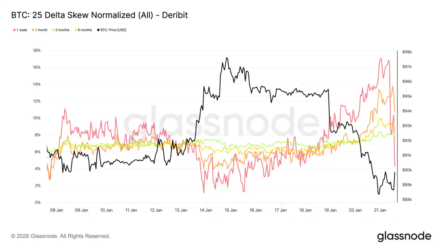 偏度如此剧烈的倾斜通常伴随局部极端行情,此时市场仓位拥挤,难以延续原趋势。在达沃斯论坛相关言论影响被市场消化后,下跌方向的溢价已被部分获利了结,偏度开始迅速回撤。