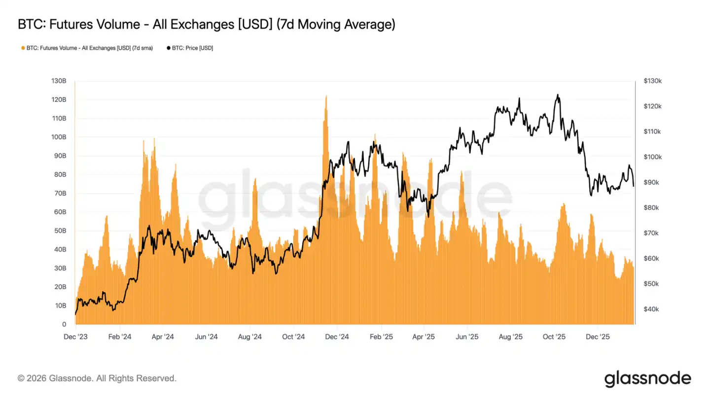比特币期货的 7 日移动平均交易量持续萎缩,远低于通常与趋势行情相伴的水平。近期的价格波动并未伴随交易量的有效放大,凸显出衍生品市场参与度低、信心不足的特点。