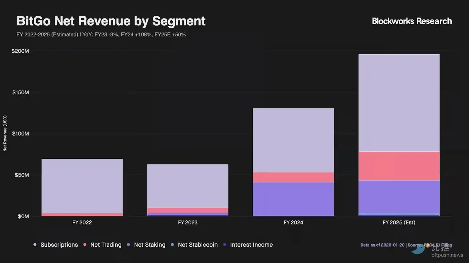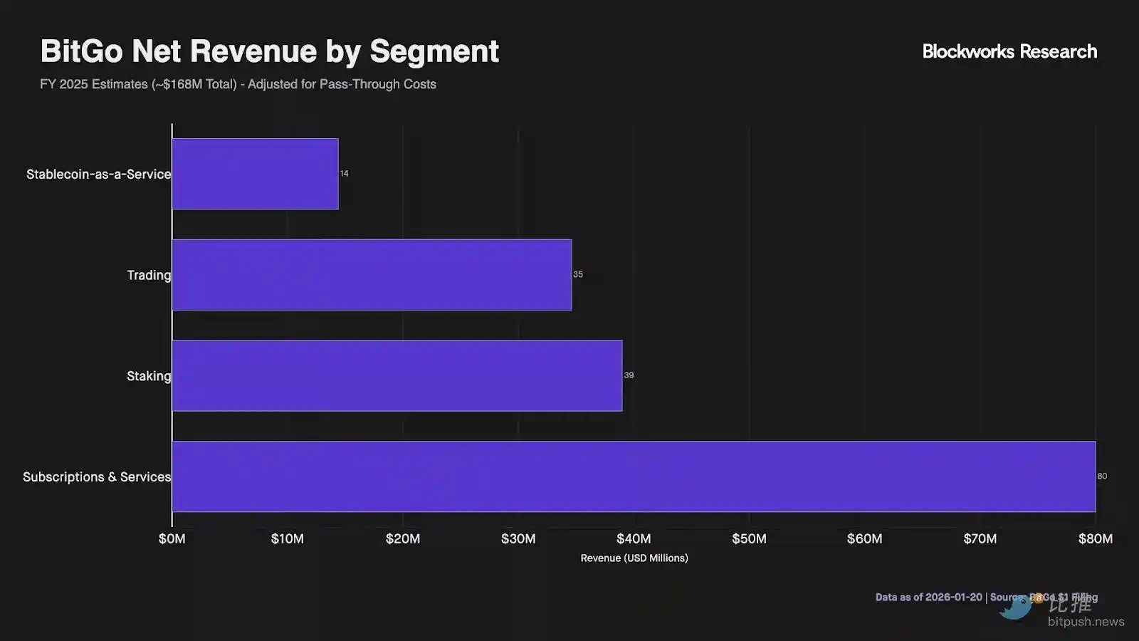 根据 Blockworks Research 的图表数据,BitGo 的核心经济收入(剔除掉代缴费用和 pass-through 成本)在 2025 财年预计约为 1.959 亿美元。其中,订阅业务贡献了绝大部分高利润的经常性收入,该业务以 8,000 万美元 的贡献了总净收入的近 48%。这部分收入主要来自 BitGo 对 4,900 多家机构客户收取的经常性费用。