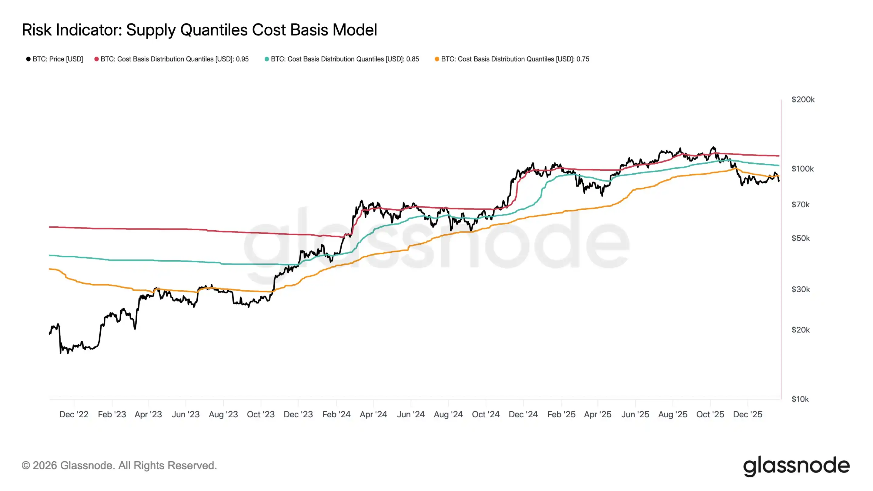 比特币的轨迹形成鲜明对比。2025 年触及 12.6 万美元峰值后,在 9 万美元附近盘整。glassnode 发文表示,比特币已失去 0.75 供应成本分位数且未能收复。目前现货交易价格低于 75% 供应量的成本基准,这标志着分发压力正在上升。风险水平已向上移动,除非能够重新收复该水平,否则市场将由下行趋势主导。
