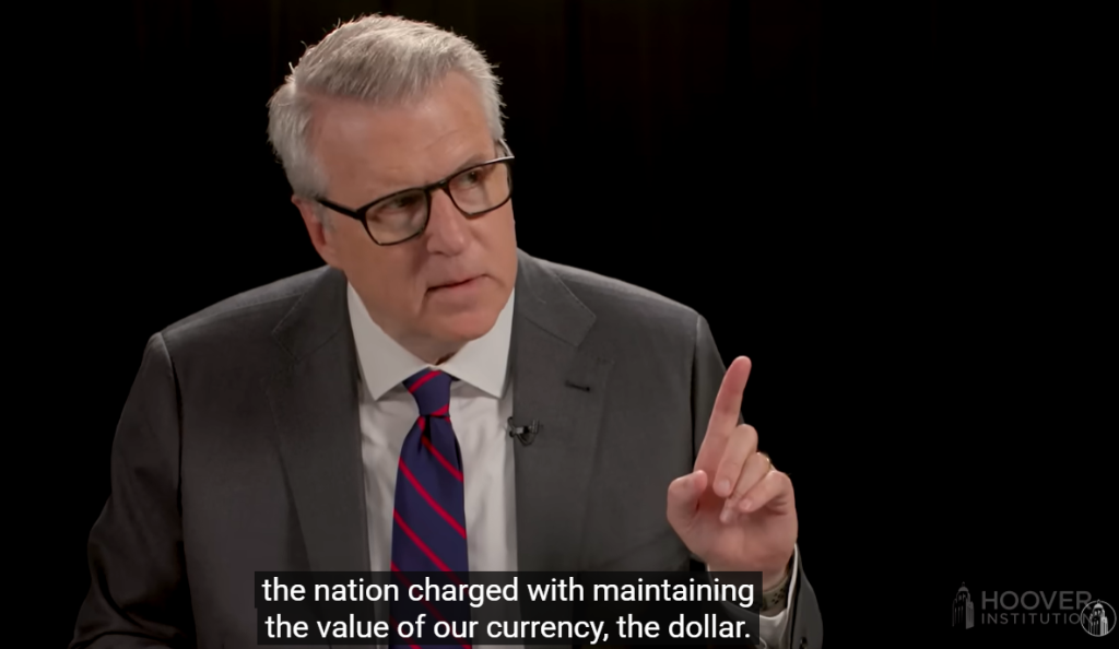 是的,所以我相信米尔顿和你刚刚传达的观点,也就是如你开场白所说,“通胀是一种选择”。确保价格稳定的职责由国会授予美联储,最近一次是在1970年代对其章程的审查中,以便有一个机构对物价负责。不要再责怪别人了。我们把接力棒交给你,中央银行。去解决它。但从最近几年的评论中,你完全不会觉得通胀是一种选择。事实上,在过去五六年大通胀酝酿期间,我们听到了关于通胀原因的什么说法?是因为普京和乌克兰。是的。是因为疫情和供应链。米尔顿听到这些会勃然大怒的。而我自己,用我自己的含蓄方式,听到这些也感到不安。这些事情确实会导致价格变动,毕竟,在市场经济中,沃尔玛的价格每天都在变。这就是市场经济运作的方式。这不是中央银行的职责去监管那些价格。但那不是通胀。那是一种商品价格水平的一次性变动。通胀是指当那种一次性价格水平变动变得自我强化时发生的情况。也就是说,更高的价格催生更高的价格。这意味着通胀最终会影响到每个家庭的餐桌和每个公司的董事会,因为你作为一个决策者,不知道价格水平会变成怎样。那不是关于普京或疫情。那是关于美联储。那是关于中央银行。恐怕近年来,这可能是因为中央银行已成为我们文化的一部分,我们有点习惯于说:“嗯,这不是我的错,是别人的错。”我认为这是米尔顿在最近时期最会感到愤怒的地方。中央银行可以实现它想要的任何价格水平,任何通胀水平。我们可能不喜欢他们实现的方式,但他们应该责怪别人的想法,我认为这与良好的经济历史背道而驰。