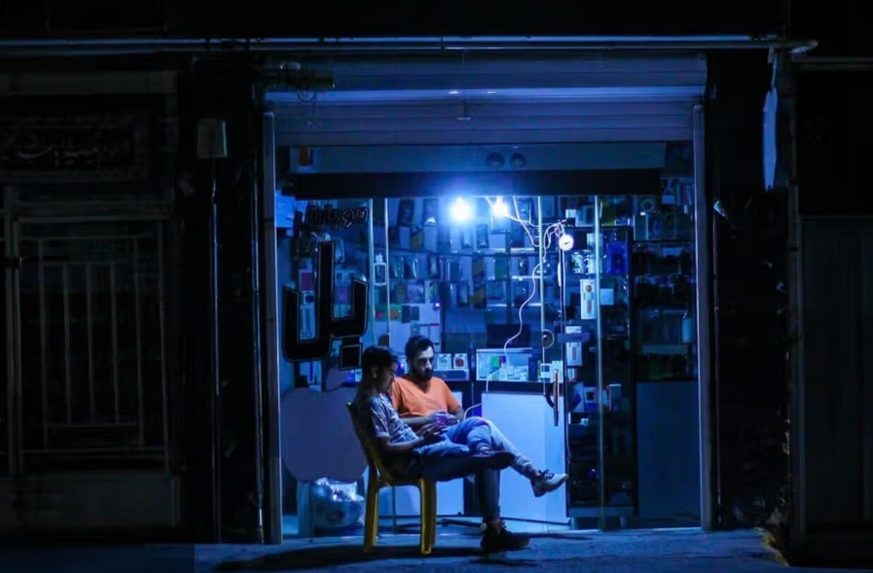图片描述:两名伊朗男子坐在自家手机店外,店内只有应急灯照明,因为停电导致街道一片漆黑