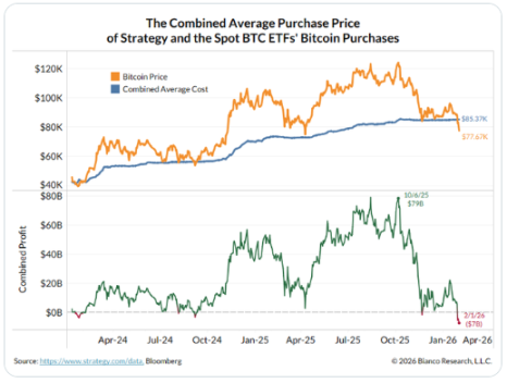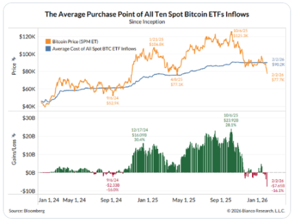 Jim Bianco 的分析显示,比特币正在被高度「机构账户化」,这意味着市场首次可以清晰地观测到大资金的持仓成本与盈亏状况。目前,MicroStrategy 与 11 只现货比特币 ETF 合计持有约 10% 的比特币流通量,其合并后的平均买入成本约为 85360 美元。按当前价格计算,这些机构持仓整体浮亏约 8000 美元 / 枚,未实现亏损总额高达约 70 亿美元。