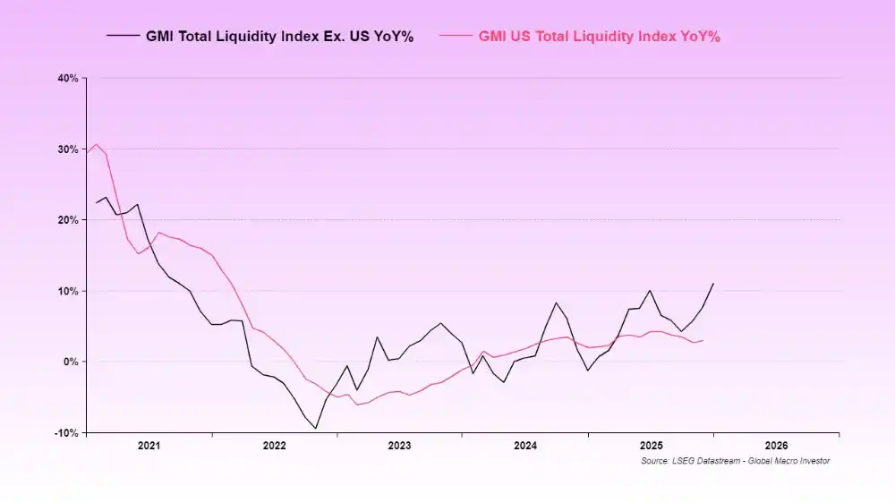 但在当前这个阶段,美国总流动性(US Total Liquidity)显然更具主导性——因为美国仍然是全球流动性的核心供给方。