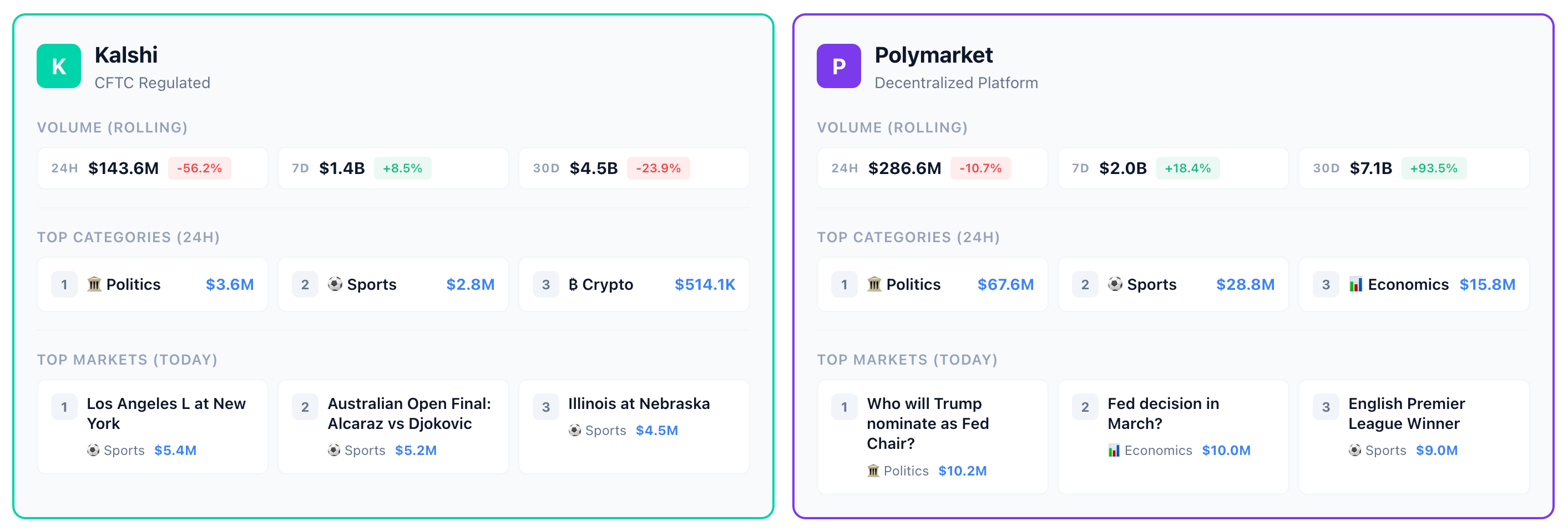 从更长周期来看,过去 30 日的交易数据呈现出明显分化:Polymarket 交易量整体保持上行趋势,或与市场对其潜在发币预期的升温有关;相比之下,Kalshi 在过去 30 日内的交易量则持续走低,呈现出较为明显的回落态势。