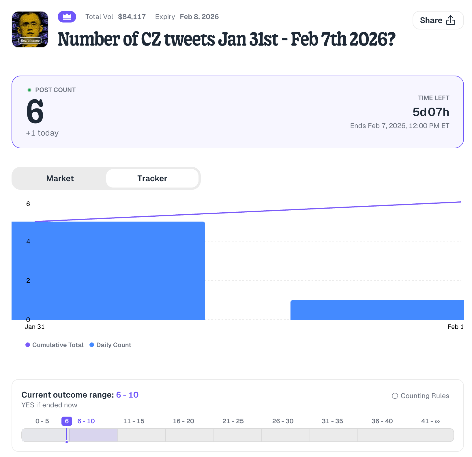 此外,为丰富上线事件的种类,predict.fun 上线了“CZ 发布推文数量”事件,增加了社区对平台的讨论度。