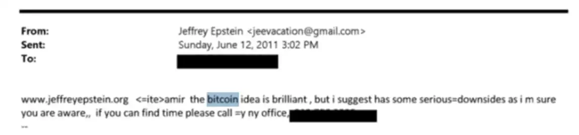 下面这封邮件的时间在 2011 年的 6 月 12 日,刚好是那一年比特币价格的顶点附近。爱泼斯坦在邮件中表示,「比特币是一个绝妙的想法,但也有一些严重的缺点。」