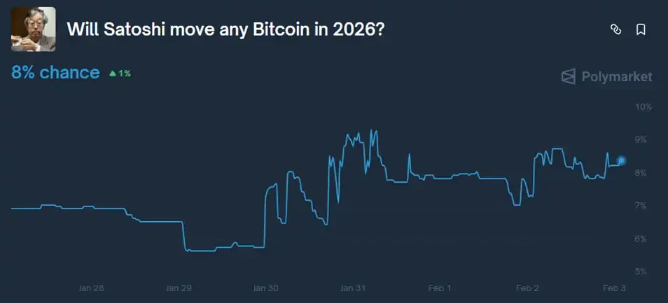 在这批最新的爱泼斯坦文件披露后,预测市场 Polymarket 上「中本聪的比特币地址在 2026 年出现动作」的可能性从约 6% 一度上升到约 9.3%,目前维持在 8%。