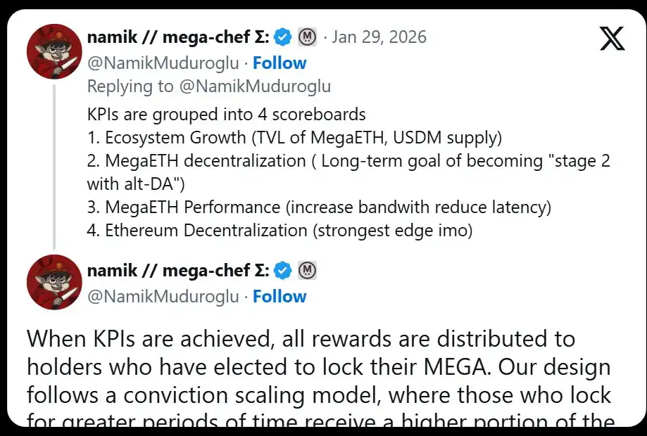 这个 KPI 计划的另一个有趣因素是:当达成 KPI 时,谁会获得 MEGA。根据 Namik 的推文,获得 MEGA 解锁的人是那些将 MEGA 质押到锁定合约中的人。