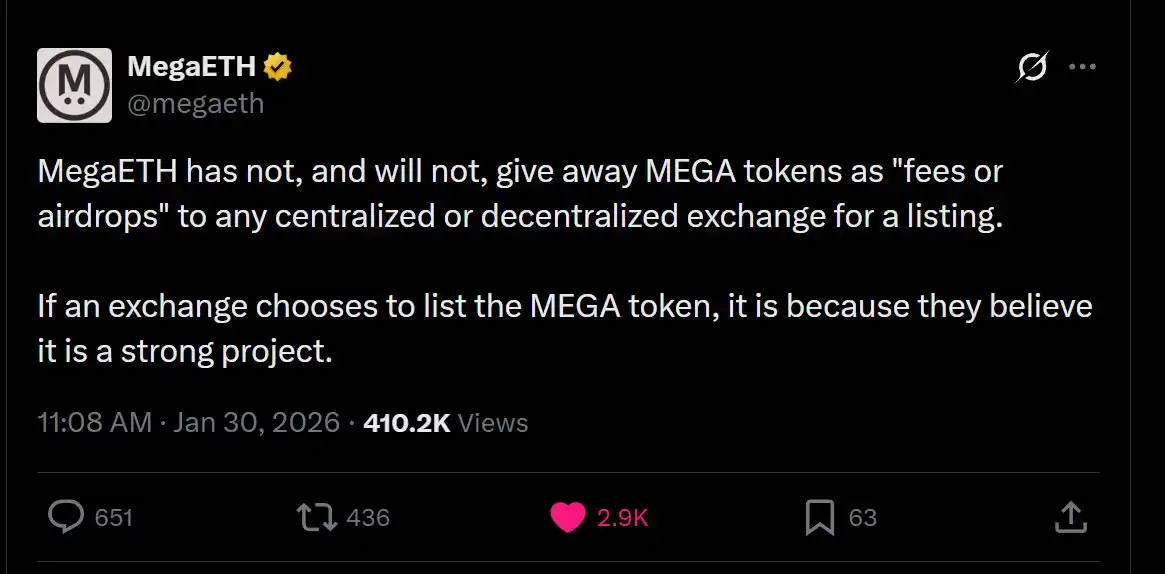 在 Binance 在其平台上开放 MEGA 代币期货后(Binance 历史上试图以此向团队勒索),你可以在 MegaETH 对 CEX 上币的哲学中看到同样的理念: