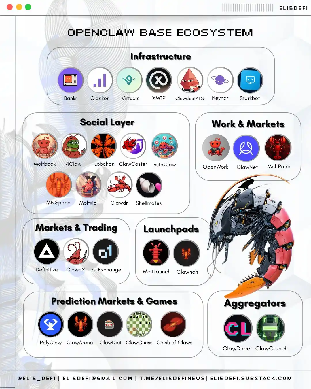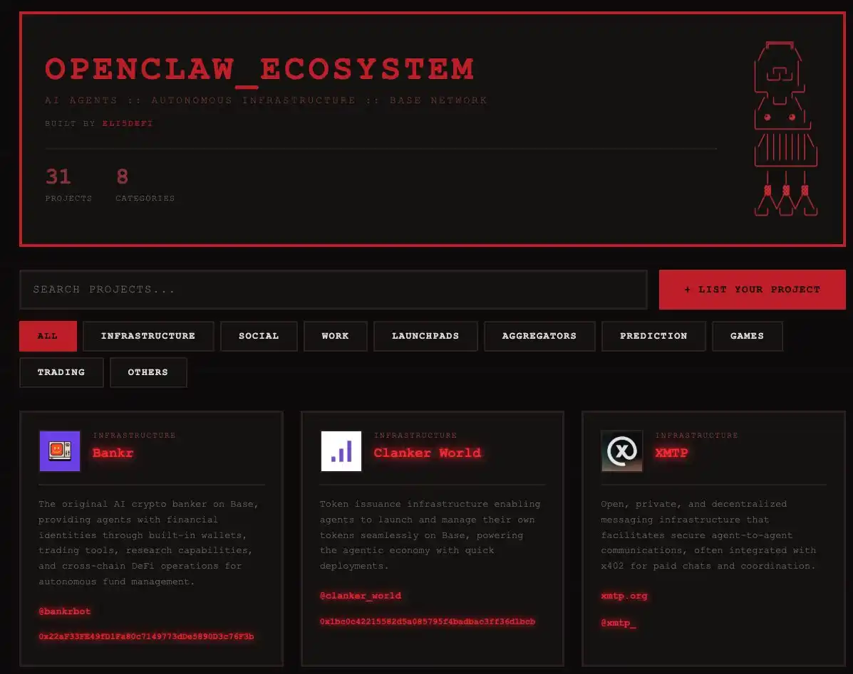 @ClawdX_ → Base 上的实验性 AI 交易智能体,用于自主交易策略,以及为 OpenClaw 智能体提供类似『Etherscan』的服务,网址为 MoltyScan.com。
