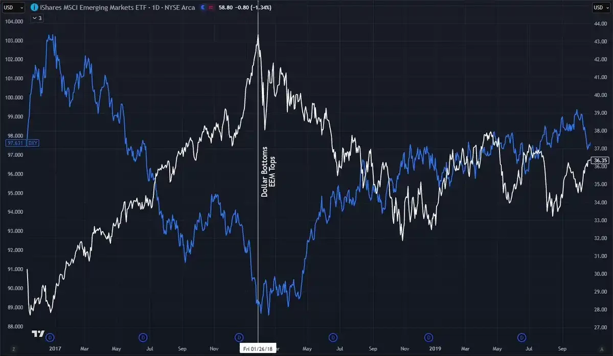 接下来发生的是一次剧烈反转。美联储收紧政策,冲击迅速传导至脆弱的新兴市场经济体。土耳其里拉崩盘,阿根廷比索遭遇 三年来最大单日跌幅。到 2018 年 8 月,EEM 跌至 41.13 美元,在短短数月内,几乎回吐了 2017 年的全部涨幅。所谓的「世代性机会」,最终变成了留给后来者的世代性陷阱。