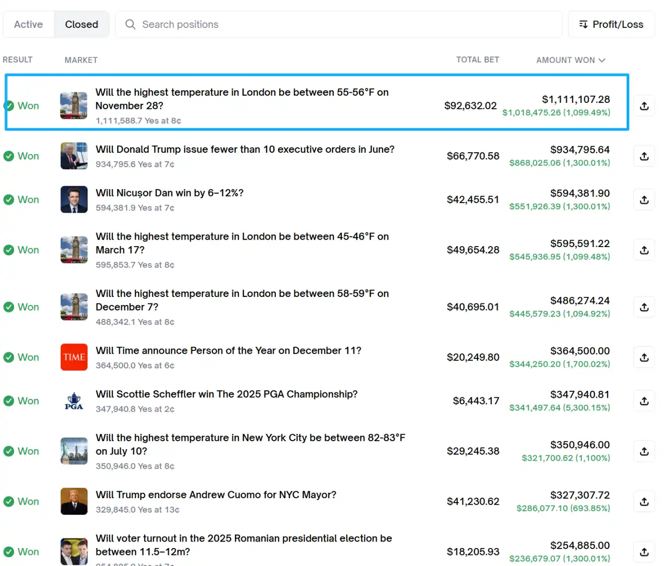 观察他的获胜记录,买入价格通常在 2¢ - 8¢ 之间。在预测市场中,这代表市场认为该事件发生的概率仅为 2% - 8%。普通玩家买 2¢ 的单子可能只投 $10,但 Hans323 敢于在 8¢ 的位置投入 $92,632(伦敦气温单)。