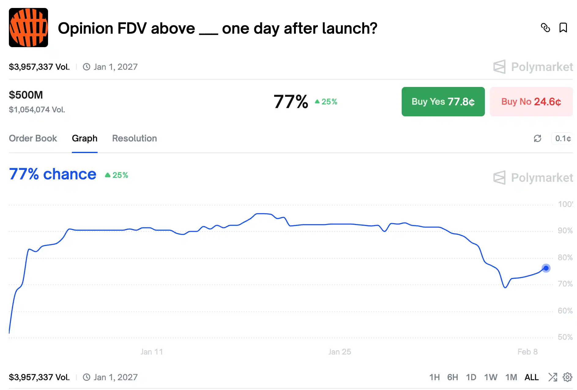 从市场预期来看,社区对 Opinion 的 TGE 表现同样保持较高关注。Polymarket 网站数据显示,「Opinion 开盘首日 FDV 超 5 亿美元」的押注事件发生概率目前高达 76%,交易量近 400 万美元。在当前山寨市场整体表现低迷的环境下,相关预测仍维持较高概率,也反映出市场普遍预期该项目在上线初期仍可能获得较强的价格支撑。