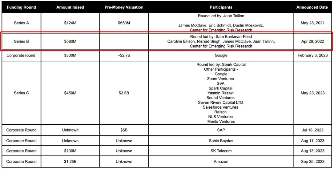 2022 年 4 月(此为官宣日期,交易实际完成于 2021 年),FTX 完成了在 AI 领域最重要的一笔投资——出资 5 亿美元领投了 AI 创企 Anthropic 的 5.8 亿美元融资,股权占比一度高达 13.56%,之后随着 Anthropic 陆续完成多轮融资而稀释至 7.84%。