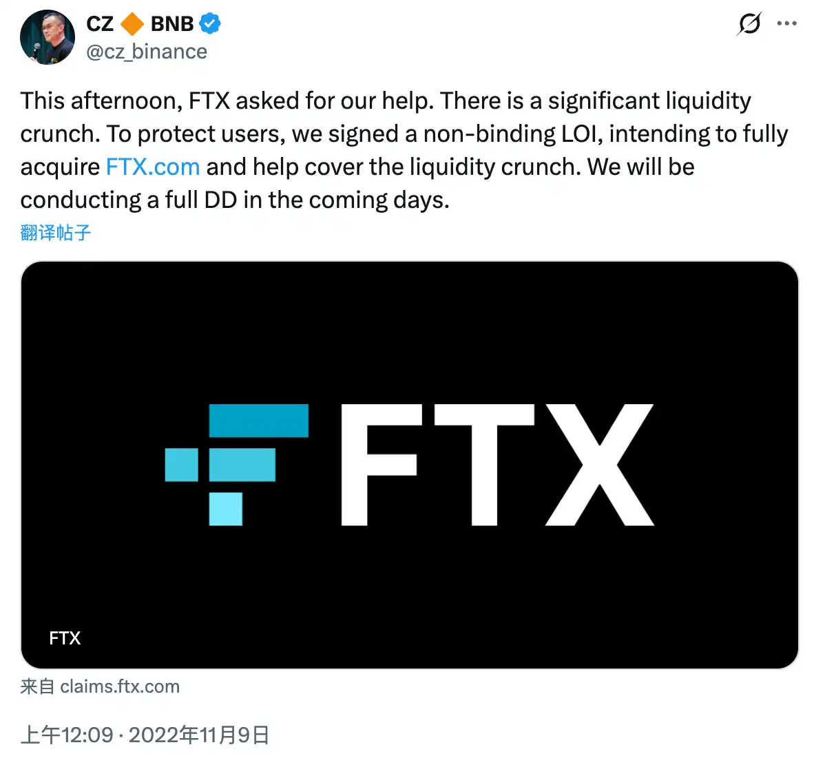 CZ:下午 FTX 向我们寻求救助。目前该交易平台流动性严重不足。为了保护用户,我们签署了一份不具约束力的意向书,计划全资收购 FTX 以缓解流动性危机。我们将在未来几天内进行全面的尽职调查。