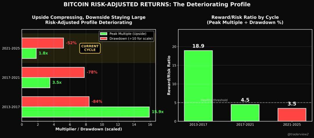 这就是当前的核心矛盾:比特币的收益空间已大幅压缩,但波动率却未同步下降。依旧是剧烈波动的行情,顶点涨幅却大幅缩水,这样的周期模式根本无法持续。