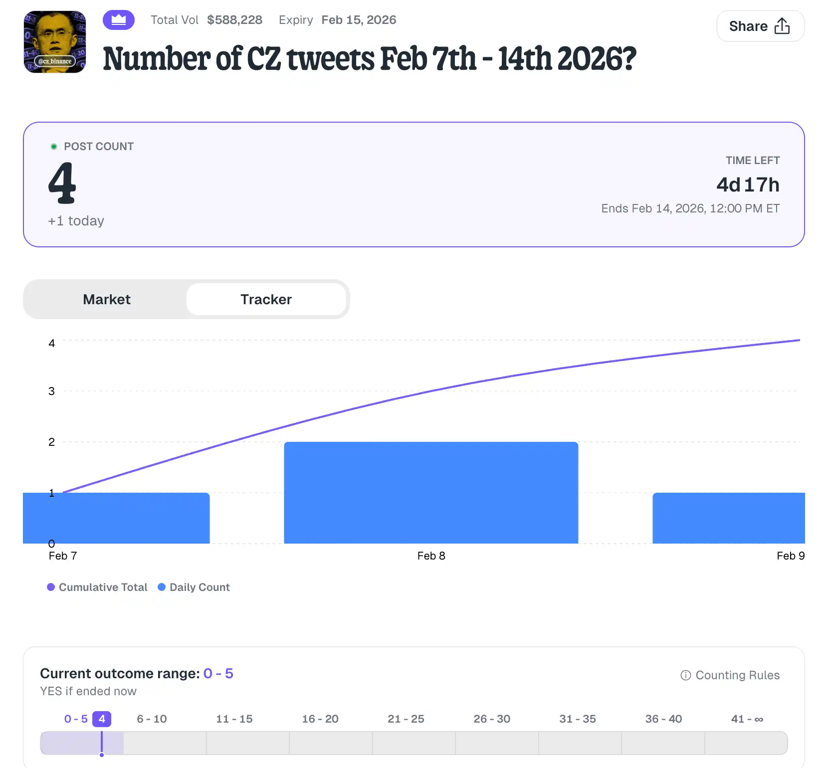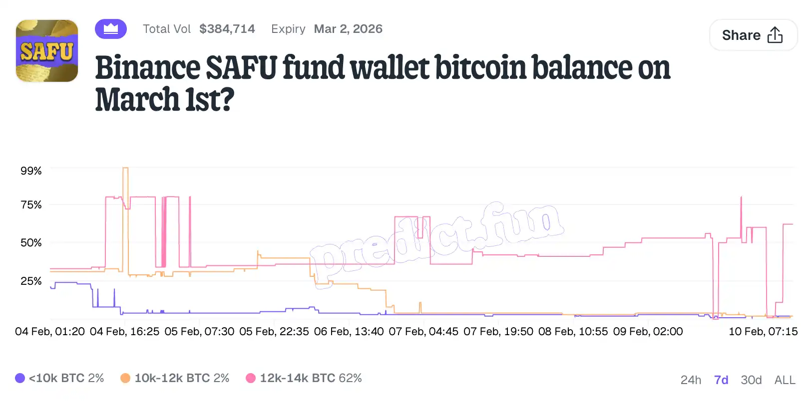 除了产品机制与交互体验外,一些新兴预测市场平台在市场内容设计上也开始尝试差异化路线,即不再单纯复制 Polymarket 或 Kalshi 上已有的通用事件,而是围绕加密社区内部关注度较高的话题,推出更具圈层属性的「专属事件市场」。例如,predict.fun 上围绕 Binance 及社区热点推出的相关预测事件,包括「3 月 1 日 Binance SAFU 基金钱包比特币余额变化情况」、「CZ 在 2026 年 2 月 7 日至 14 日期间的推文数量」等,都属于更贴近加密用户日常讨论的话题类型。